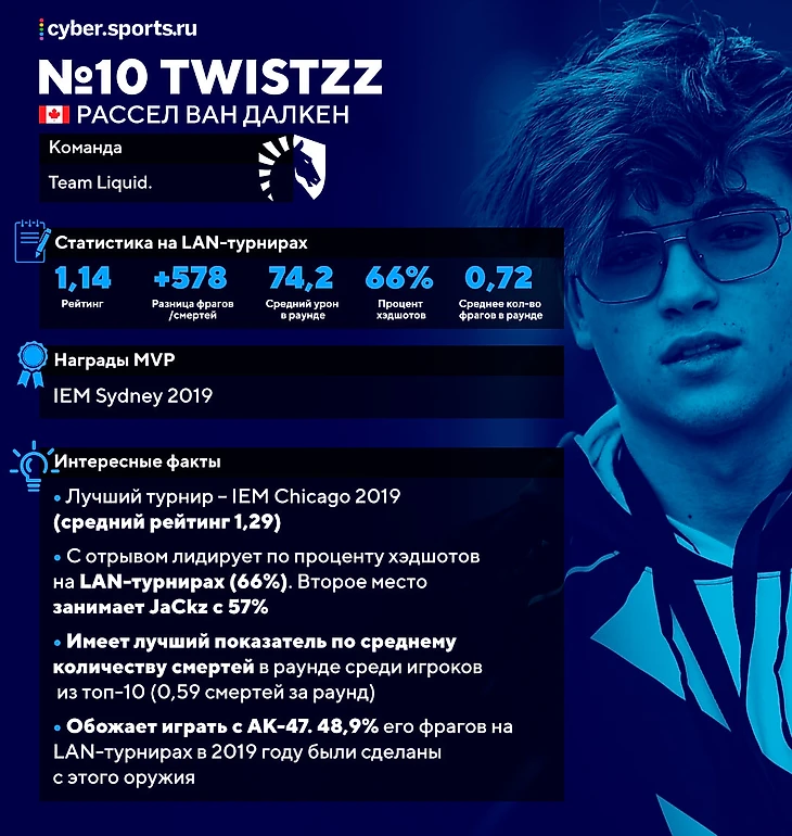 Его игра была определяющей для Liquid на протяжении всего года. В то время, как EliGE и Stewie2K были сосредоточены на энтри-фрагах, Twistzz идеально исполнял работу игрока, который подчищает косяки тиммейтов, выигрывает клатчи, а в нужных ситуациях становится луркером. Даже 2 не самых удачных турнира во второй половине 2019 года не испортили общей картины, на которой Рассел – важнейший для своей команды игрок. Только дайте ему Калаш или Дигл.