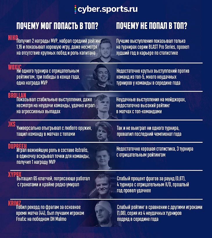 Вчера мы закончили публиковать наш рейтинг лучших игроков из CS:GO в 2019 году. В наш топ-10 могли попасть и следующие 7 игроков, но им не хватило совсем чуть-чуть. Они были недостаточно хороши для десятки лучших, но не упомянуть их было бы преступлением.