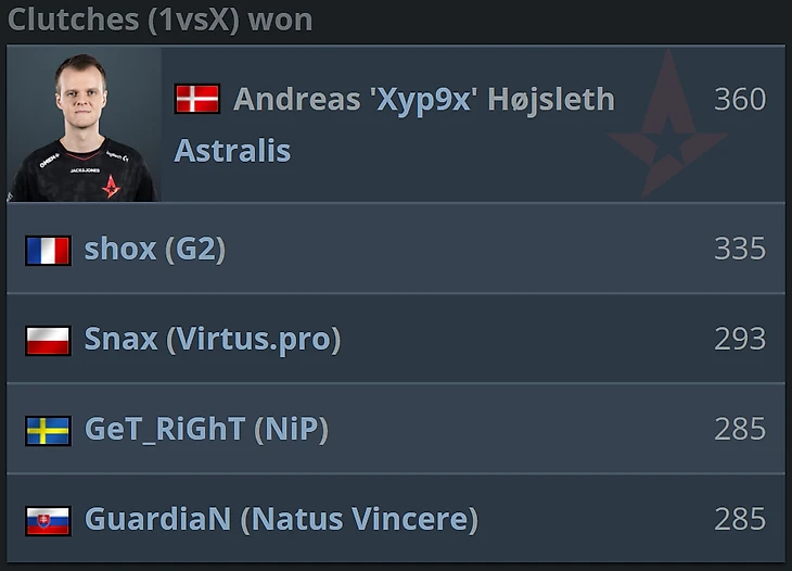 Спустя год он стал стабильнее, набрался опыта на больших турнирах, а уже в 2017 году получил MVP на IEM Katowice 2017 и окончательно зарекомендовал себя, как одного из лучших саппортов на CS-сцене. Примерно в то же время за ним закрепилось звание «министра клатчей», которое он подтверждает до сих пор. Сейчас Xyp9x – лучший клатчер на про-сцене – столько же раундов 1 в X на ланах (360) не выигрывал никто.