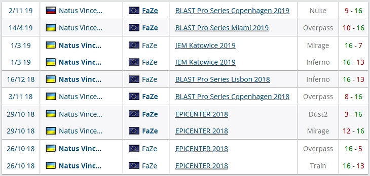 После этого NAVI играли с Faze Clan трижды, причем две игры заканчивались для СНГ-состава неудачно. Оба матча проходили на турнира серии BLAST, где Faze Clan традиционно показывает отличную игру.