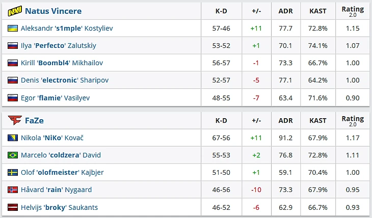 Сейчас NAVI оказались сильнее, но стоит отметить, что победа все равно не далась команде легко. Сегодняшний матч объединяет с двумя прошлыми один статистический факт: Faze Clan отлично умеет ограничивать скилл игроков Natus Vincere и их действия по карте. В каждом из проигранных матчей против Faze в прошлом году только один игрок NAVI набирал положительный K/D.