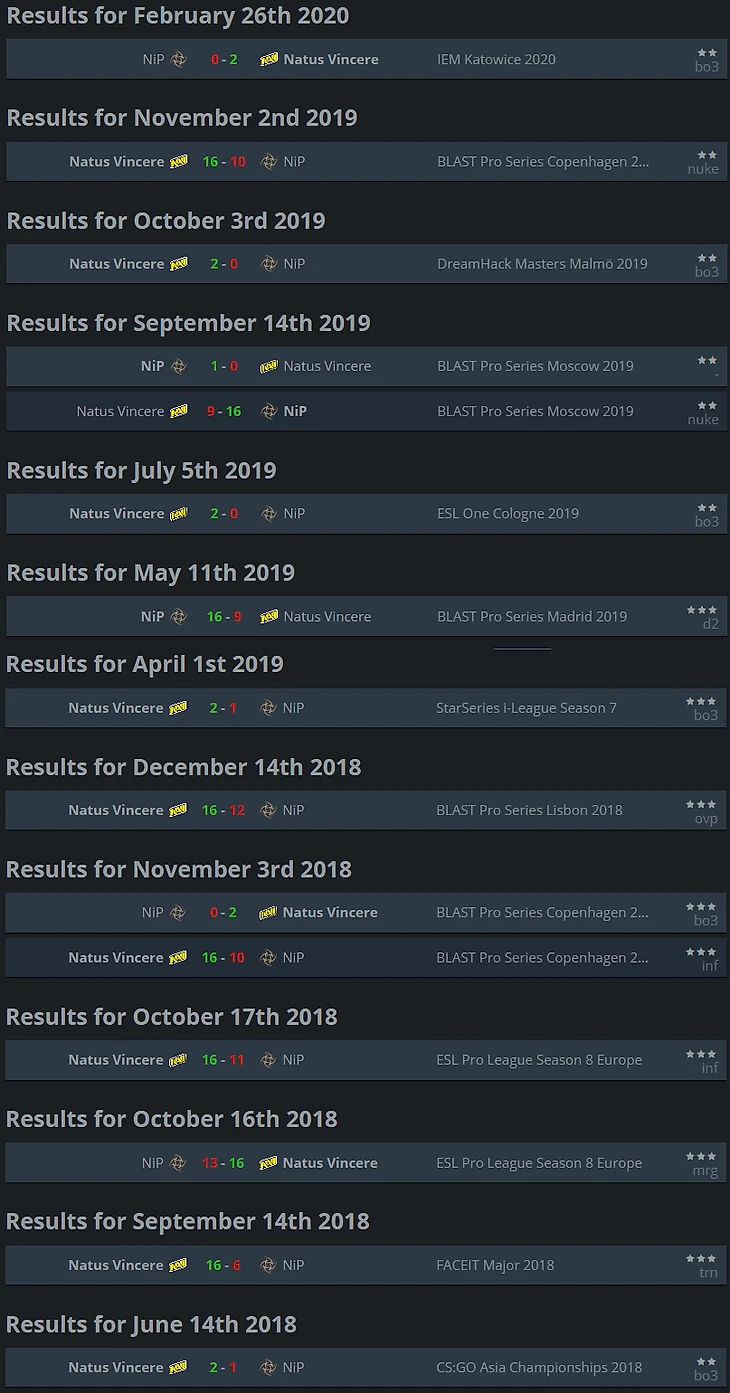 В последний раз шведская команда побеждала Natus Vincere в Bo3 еще в сентябре 2017 года – примерно два с половиной года назад. После этого команды встречались друг с другом 14 раз (если не считать шоуматч на BLAST Moscow), и в этих матчах NAVI выиграли 18 карт из 22, причем большинство из них – с разгромным счетом.