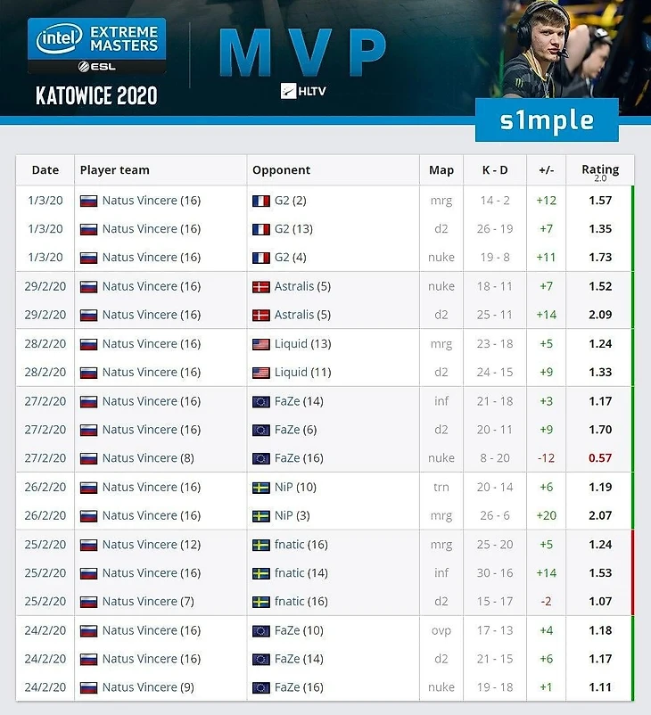 NAVI обыграли G2 в финале IEM Katowice! Награду MVP получил S1mple. Средний рейтинг Саши на турнире – 1,33. Второе место по рейтингу занял Зайву с 1,24, а третье – Ропз (1,21).