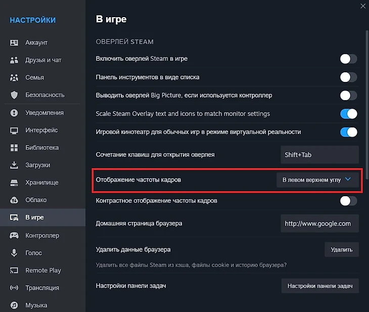 В настройках нужно выбрать вкладку «В игре», а затем включить «Отображение частоты кадров». Вы также можете выставить местоположение, где именно будет показываться количество ФПС.