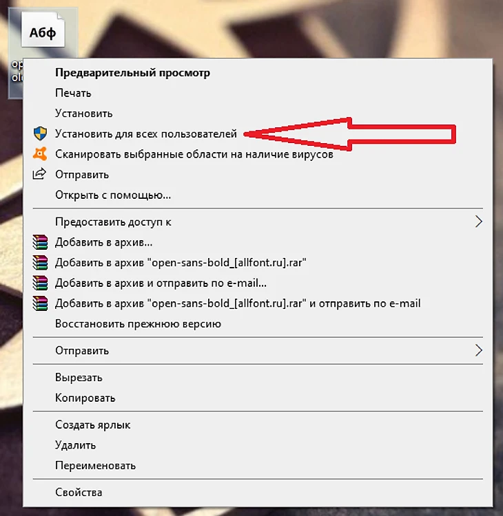 После скачивания шрифта вам понадобится добавить его к себе в систему. Нажмите правой кнопкой мыши по файлу со скачанным шрифтом и выберите «Установить для всех пользователей».