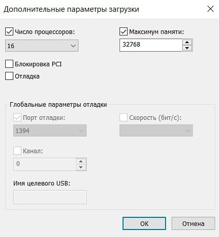 Параметры загрузки. Для настройки параметров загрузки необходимо зайти в конфигурацию системы (зажимаем на клавиатуре Win+R, в появившемся окне прописываем «msconfig» без кавычек), а затем открыть вкладку «Загрузка». Здесь нужно нажать на кнопку «Дополнительные параметры» и в появившемся окне выбрать максимальное число процессоров и максимальное количество памяти.