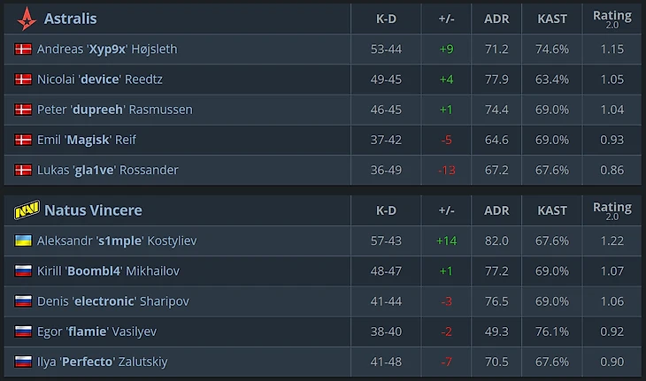 Boombl4 уступил Симплу по общему количеству фрагов, но все равно оказался гораздо лучше остальных тиммейтов. Счет 48-47 против Astralis – отличный результат, тем более для капитана.