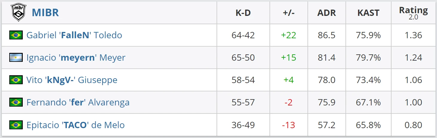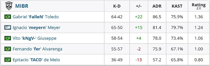 Ведущей силой бразильской команды стал 28-летний FalleN, который, похоже, переживает вторую молодость. Он входит в топ-6 лучших игроков всей лиги, а вчера его игра позволила MIBR победить Havu со счетом 2-1. В овертайме второй карты от сделал клатч 1 в 4 с AWP, который во многом решил судьбу матча.