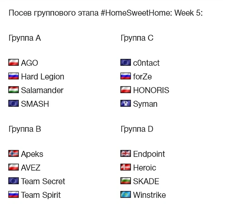 Организаторы Home Sweet Home объявили полный список участников пятой игровой недели чемпионата. В числе приглашенных команд пять представителей СНГ – Team Spirit, Winstrike, forZe, Hard Legion и Syman.