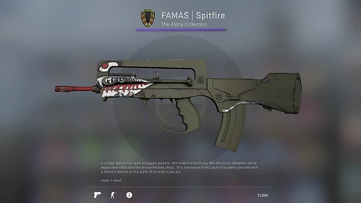 Этот скин на Famas – торжество минимализма. Создатель раскраски просто сделал пушку серо-зеленой и поместил на переднюю часть зубастую морду, как часто делали на истребителях.