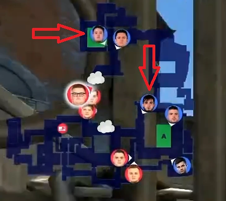 Вот так выглядела карта расположения игроков Vitality в большинстве раундов второй половины. Бешеных фрагов на миде от ZywOo определенно не хватало французской команде.
