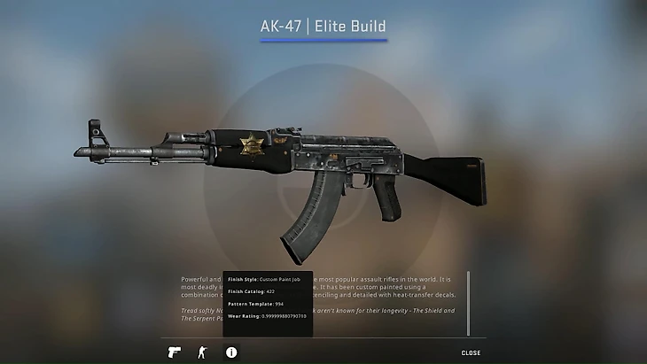 Этот Калаш – официально самое поношенное оружие за всю историю CS:GO. Пушка хранится в инвентаре одного из богатых коллекционеров и имеет степень износа 0,99999988 – самый большой показатель в игре. Что интересно, сам скин выглядит достаточно круто для такого качества. Да, почти вся лицевая раскраска и рисунок на магазине полностью уничтожены, но черные части оружия все равно выглядят крайне стильно.