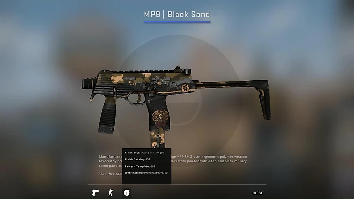 То же самое касается и этой версии MP9, которая входит в топ-5 самых поношенных скинов во всей игре. Согласитесь, оружие не выглядит так уж отвратительно, как можно было подумать по степени износа.