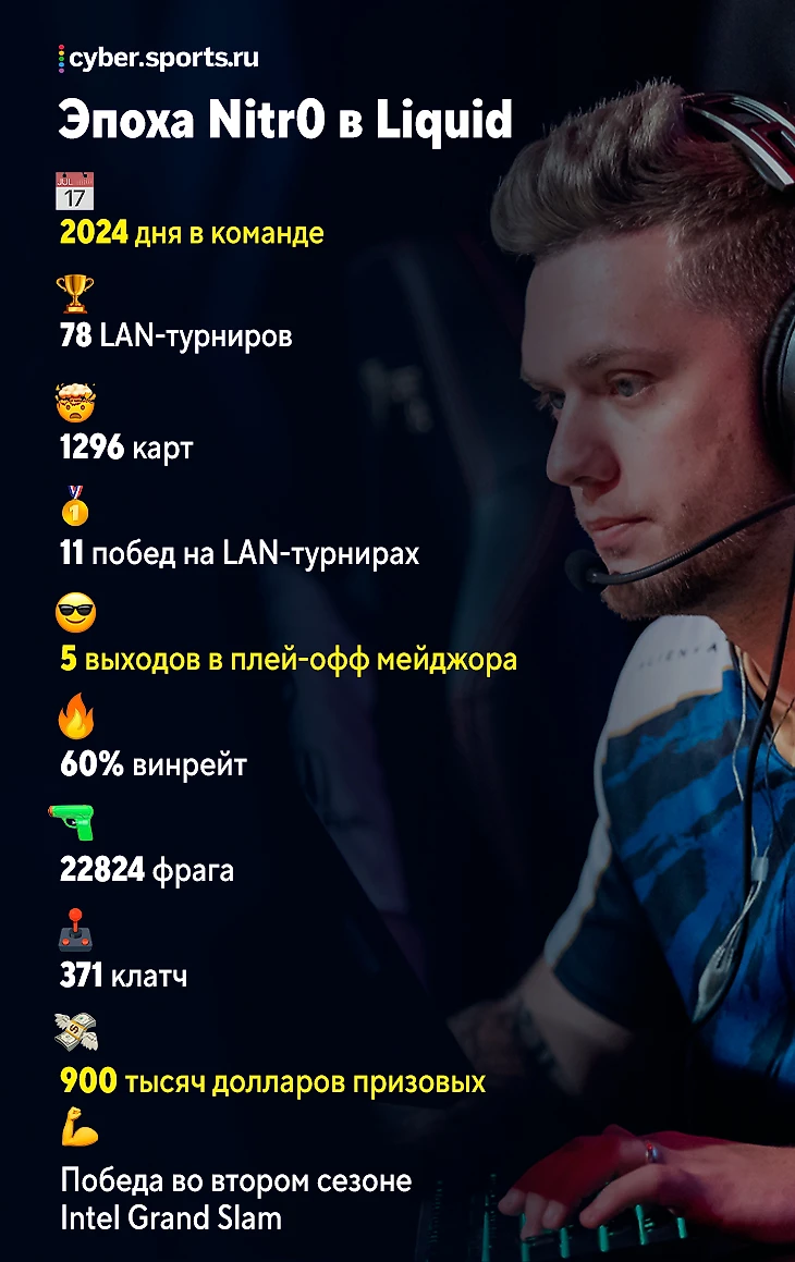 2024 дня в команде. Nitr0 и EliGE – рекордсмены по игре в одной организации среди всех североамериканских игроков. За эти пять с половиной лет игрок пережил с Liquid все возможные эмоции: провал в квалификации на мейджор, критику от фанатов, а затем выход в финал мейджора и победу на шести турнирах подряд. Все это время Nitr0 был связующим звеном в команде и помогал тиммейтам как ассистами в игре, так и морально за ее пределами.