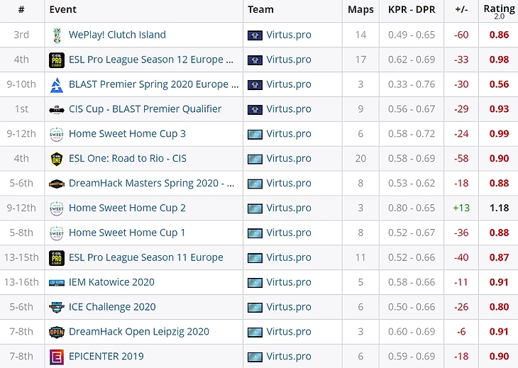 На рейтинг игрока в Virtus.pro не взглянешь без слез. За 14 турниров в организации AdreN лишь единожды закончил чемпионат с положительной статистикой. Для сравнения: SANJI, которого порой критикуют не меньше Адрена, завершил 4 ивента в плюсе по статистике.