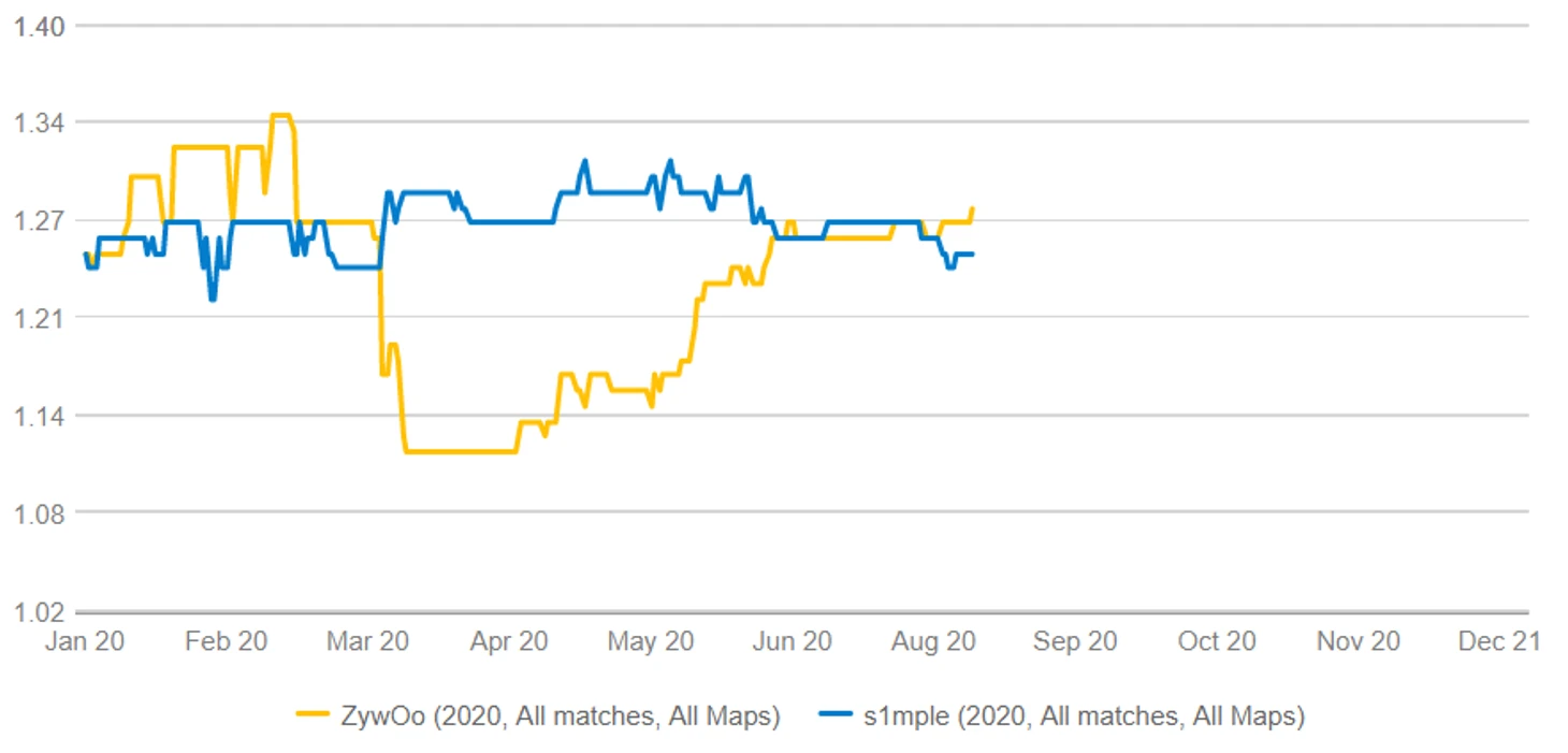 Если в чем-то ZywOo и проигрывает Симплу, так это в стабильности. После перехода в онлайн он показывал не самый лучший рейтинг. S1mple же, как можно увидеть на графике, почти всегда был в топе таблицы очков. К окончанию сезона ZywOo выправил статистику и догнал Симпла, но тот небольшой спад значительно повлиял на его общий рейтинг.