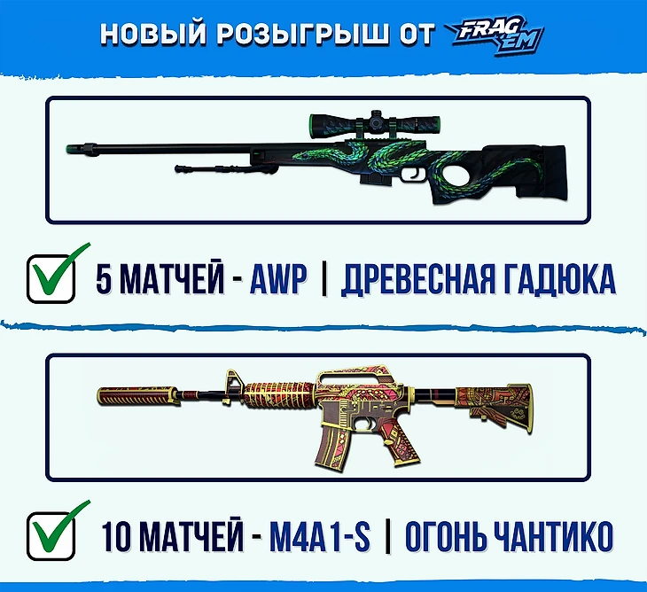 На этой неделе, сыграв определённое количество игр, игроки могут выиграть такие скины: ✅ 5 матчей — участие в розыгрыше AWP | Древесная гадюка ✅ 10 матчей — участие в розыгрыше M4A1-S | Огонь Чантико Побеждать во всех матчах не обязательно, главное - доиграть их до конца.