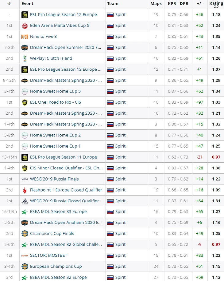 Его статистика по турнирам – за гранью понимания. На 25 чемпионатах в Team Spirit он лишь дважды показал отрицательную статистику. Причем и на этих турнирах его рейтинг был не провальным, а вполне достойным – 0,97.