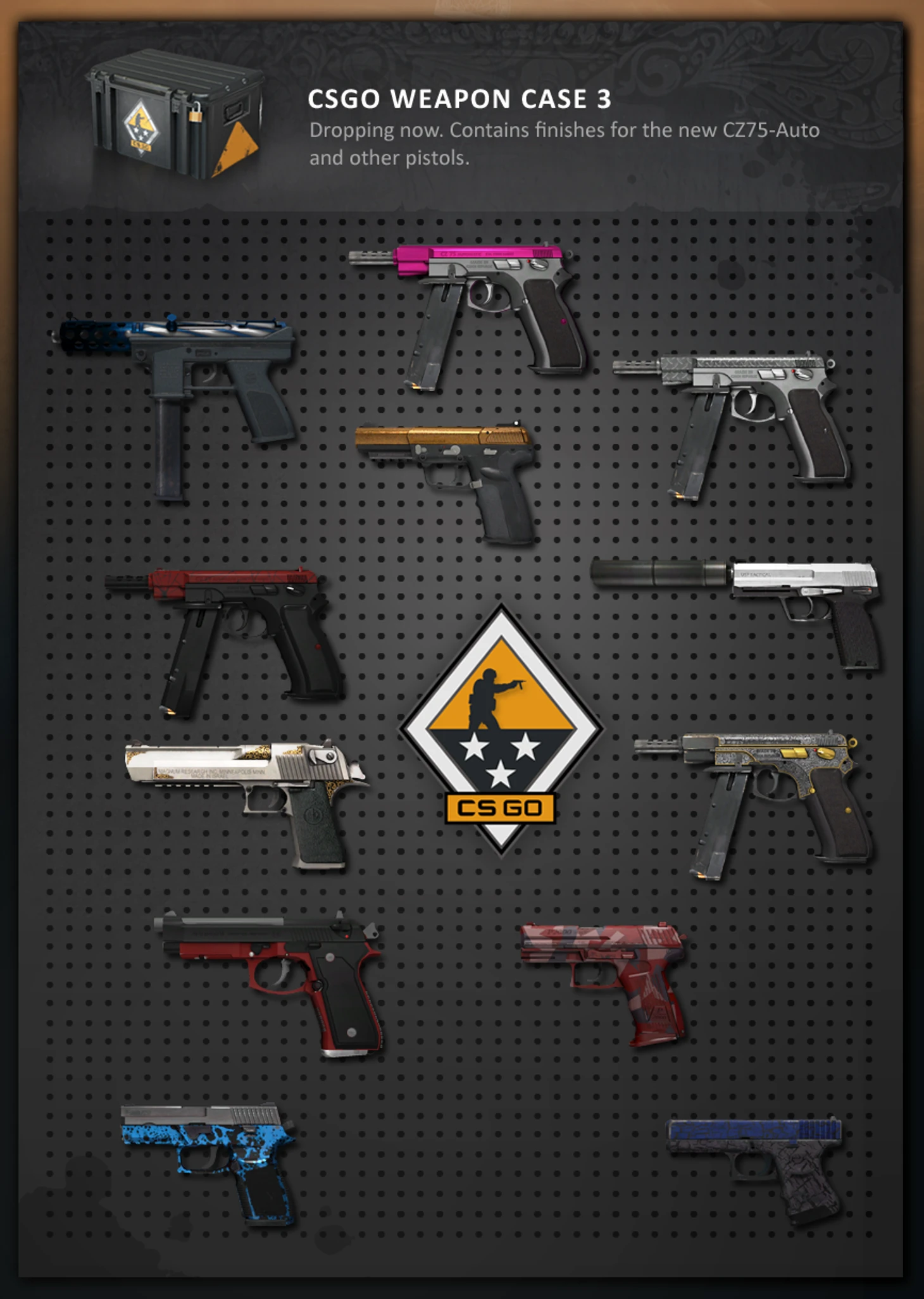 С 2013 года Valve выпускает сундуки для CS:GO, среди которых есть как удачные, так и достаточно скучные. Сейчас в игре уже есть более 30 оружейных кейсов с абсолютно не похожими друг на друга скинами