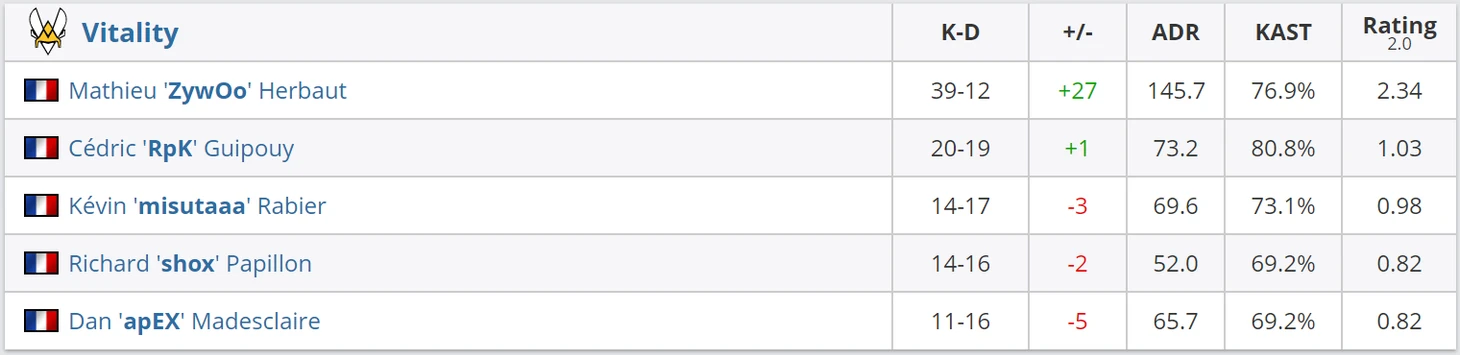 Благодаря этому эйсу игрок Vitality установил личный рекорд. Карта Mirage стала для него лучшей в карьере по среднему рейтингу против команд из топ-20. 39 фрагов и 12 смертей за 26 раундов – это фантастика.