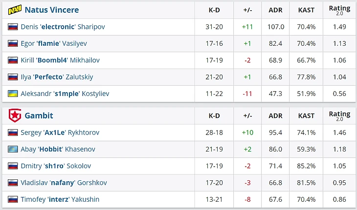 NAVI достаточно комфортно победили Gambit со счетом 2-0 в четвертьфинале IEM New York. Наконец-то у «рожденных побеждать» практически не было критических ошибок и проигранных эко-раундов, но команда удивила в другом: на второй карте Overpass неудачно отыграл S1mple, который обычно лидирует в таблице игроков.