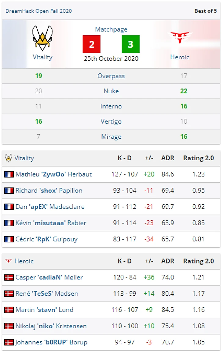 Вот и завершился Dreamhack Open Fall 2020, на данный момент являющийся последним в серии турниров RMR в Европе. Команды Vitality и Heroic выдали огненный финал, в котором в серии из 5 карт лучшей стала команда из Дании.