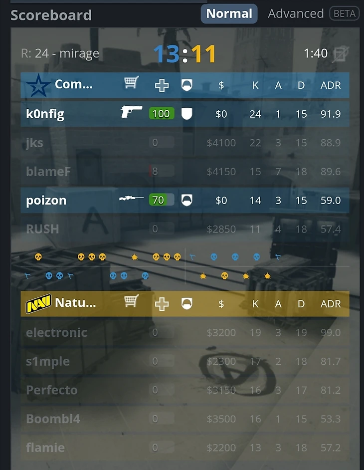 Каждый раз, когда казалось, что Complexity выглядят гораздо сильнее в конкретном раунде, у NAVI залетали сумасшедшие выстрелы. При счете 9:11 у игроков защиты был отличный сетап на точке В, но он развалился всего лишь от двух хэдшотов со стороны террористов.