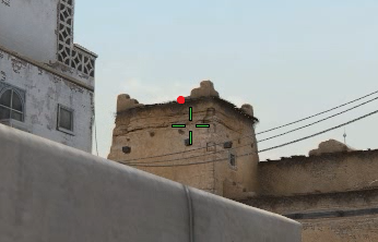 Целимся в самую левую часть выступающей фигуры на крыше здания.