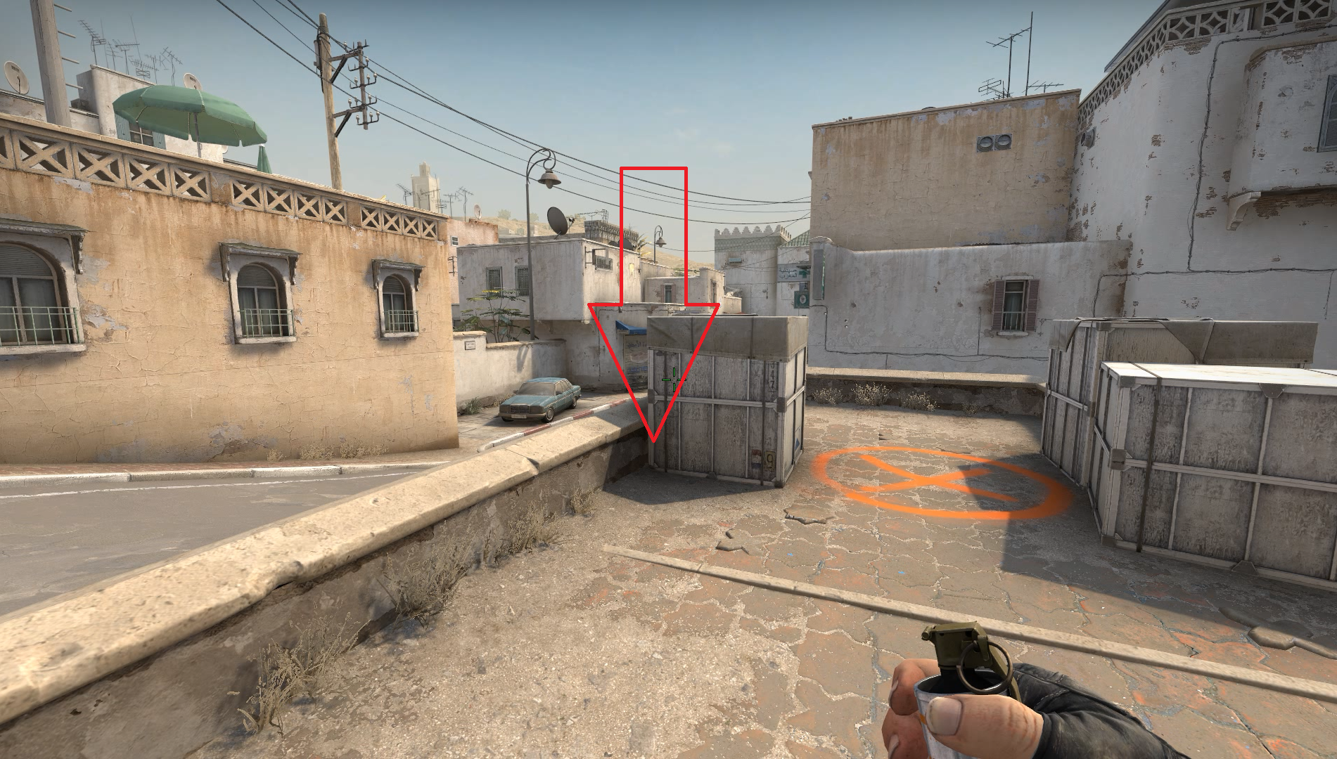 Эта раскидка поможет игрокам, которых быстро поджимают соперники с длины. Чтобы ослепить террористов такой гранатой, подходим в упор к левому ящику на пленте.