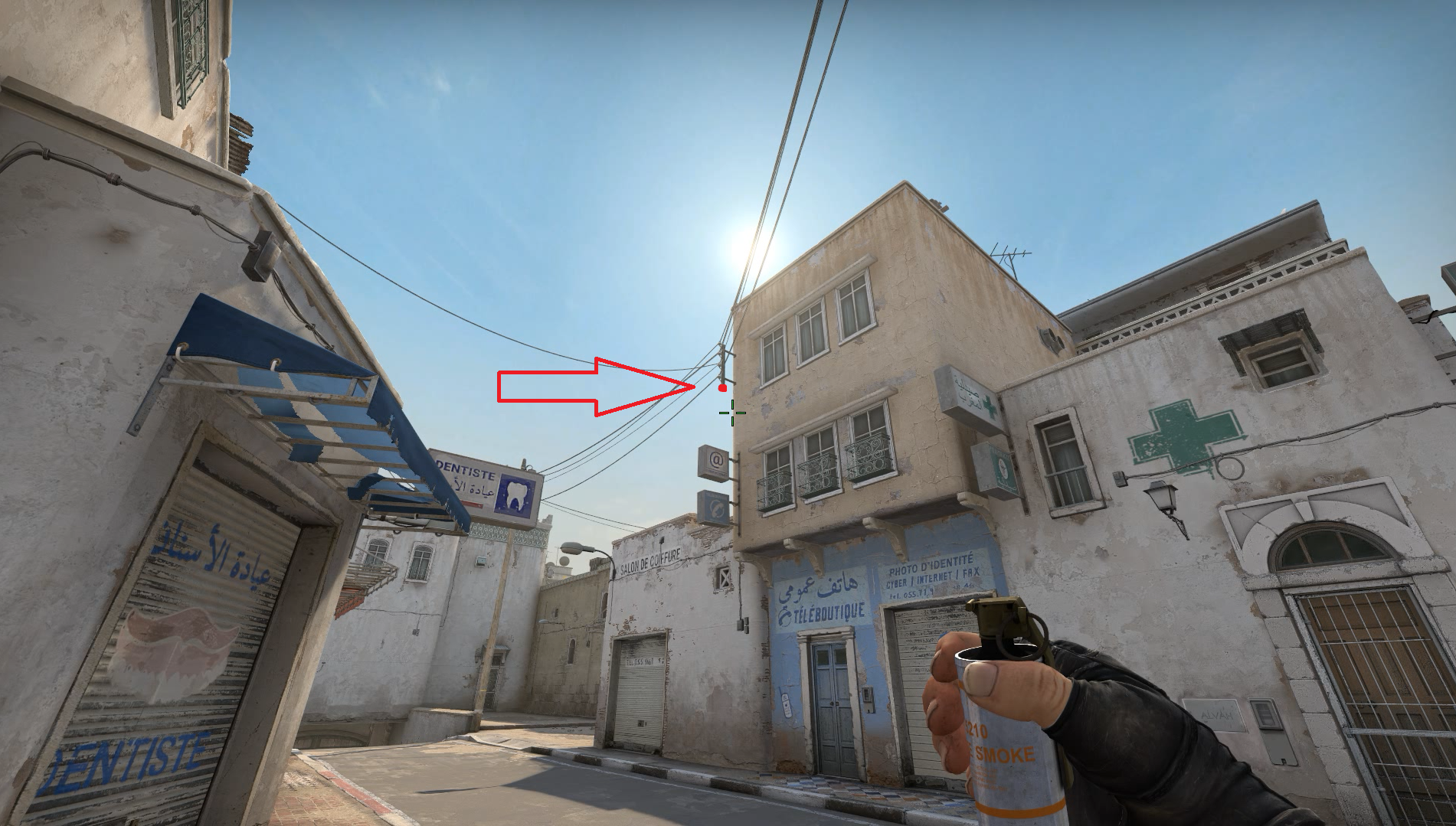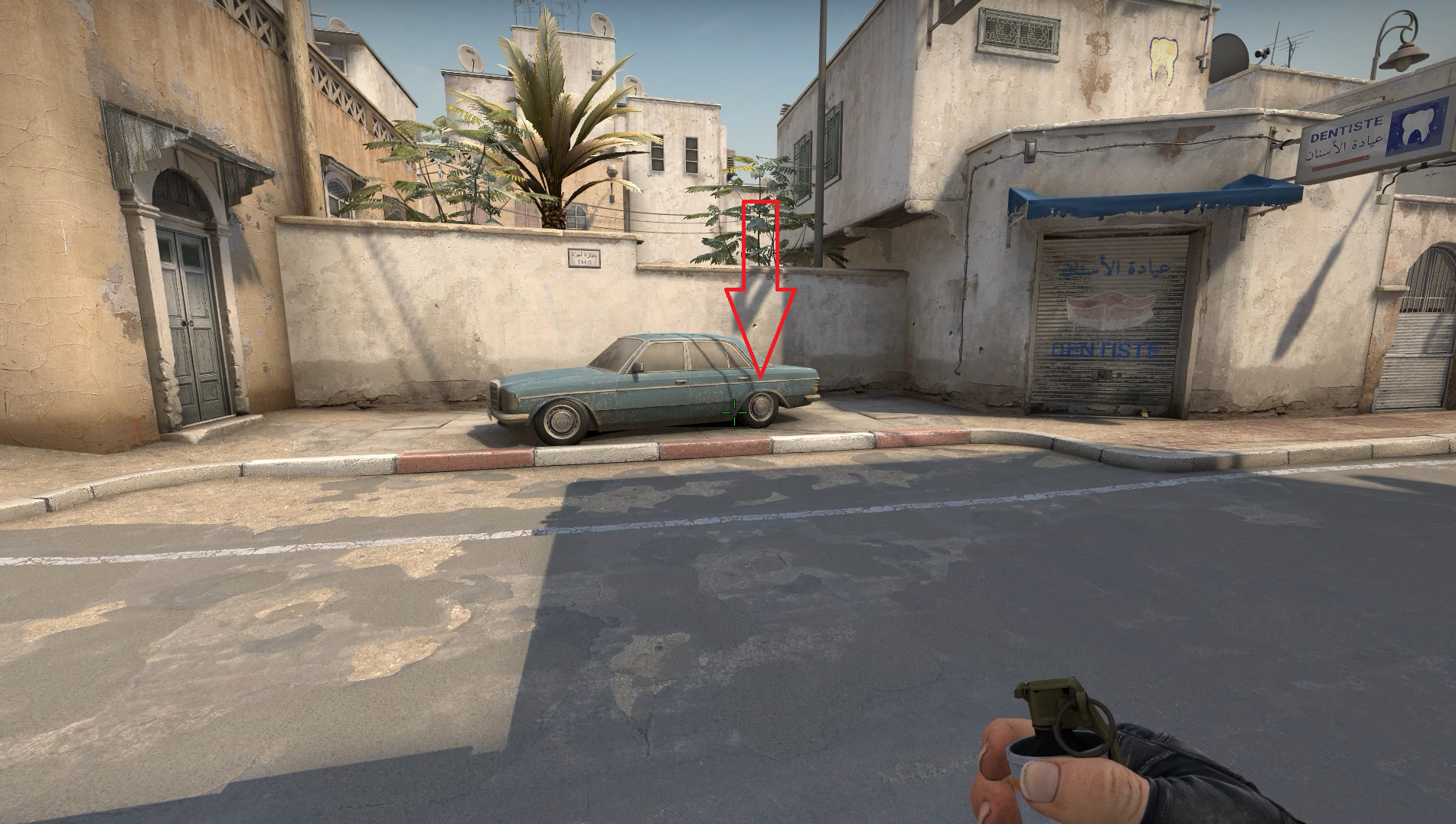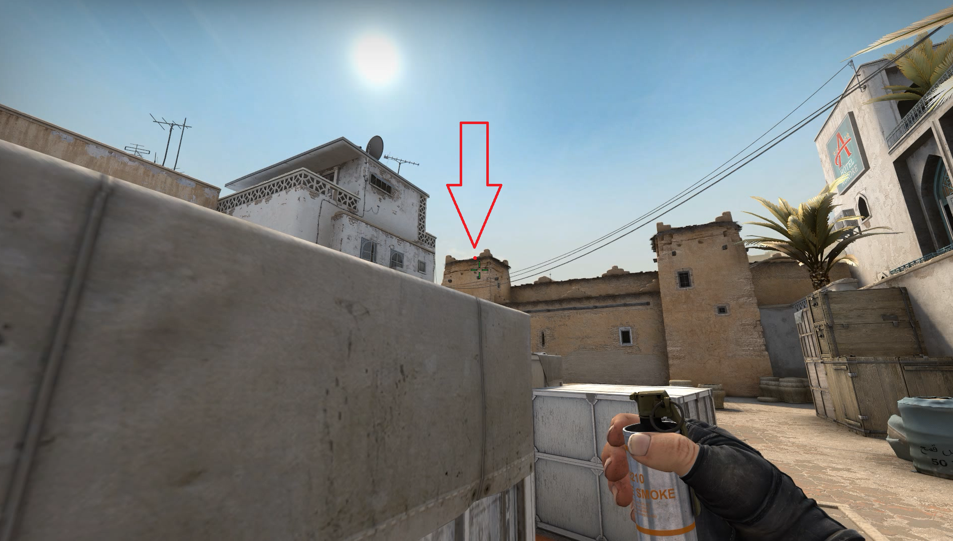 Вот на эту точку необходимо прицелиться, а затем бросить смок с места.