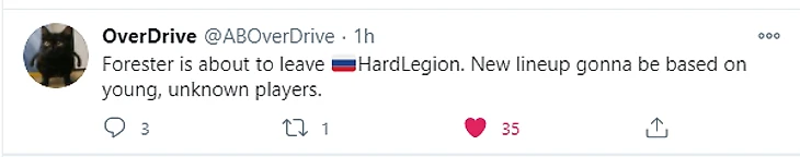 А Форестеру хочется пожелать удачи, ему всего 20, вся карьера еще впереди. Кто знает, может через пару-тройку лет он все-таки примерит форму желто-черных. UPD от 11.11.2020 19:56, Овердрайв в своем твиттере сообщил, что Форестер покинет Hard Legion, и новый лайнап будет строиться вокруг новых неизвестных игроков.
