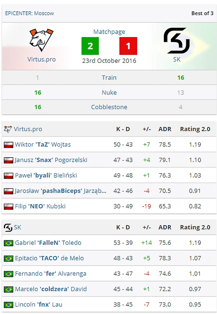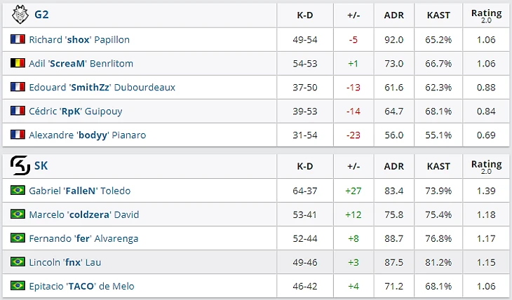 Сама же игра закончилась со счетом 2-1 в пользу SK. Все бразильцы закончили встречу с рейтингом в плюс.