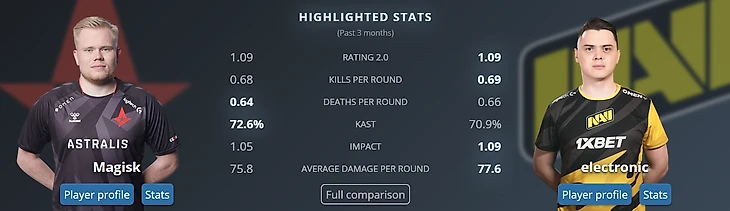 Раньше этот матчап привлекал зрителей из-за противостояния снайперов Девайса и Симпла. Теперь же у Костылева появился более похожий по стилю соперник – ZywOo, а датчанин отошел на второй план. Сейчас в матчах Astralis и NAVI увлекательно наблюдать за борьбой Мэйджиска и Электроника – вторых звезд команд, которые уже второй год идут нос к носу по статистике.