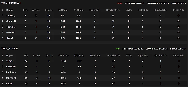 S1mple подтверждает индивидуальную стабильность и в рамках FACEIT Pro League. Лучшей демонстрацией формы игрока стала разгромная победа его команды над стаком Гардиана 16:0. Как и в большинстве последних игр FPL, лидером по KDA в матче был S1mple.