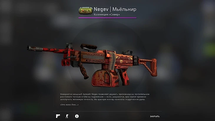 Бюджетный Negev «Рыба-лев» обойдется в 50 рублей за качество «Немного поношеный». А вот за красный Негев «Мьельнир» в качестве «Прямо с завода» придется заплатить более 50 тысяч рублей! Цена обусловлена возможностью крафта AWP «Гунгнир» за 500 тысяч рублей.