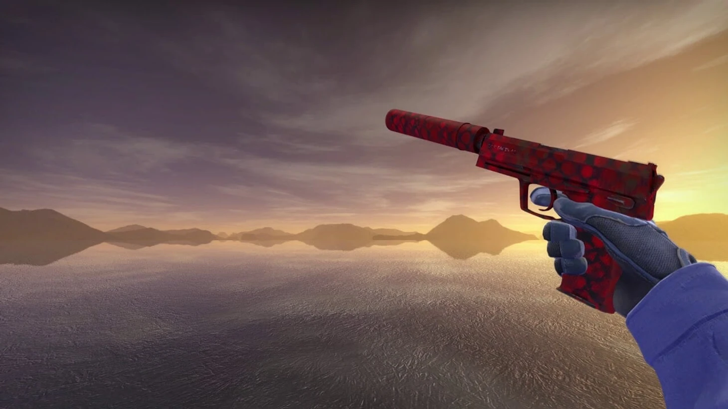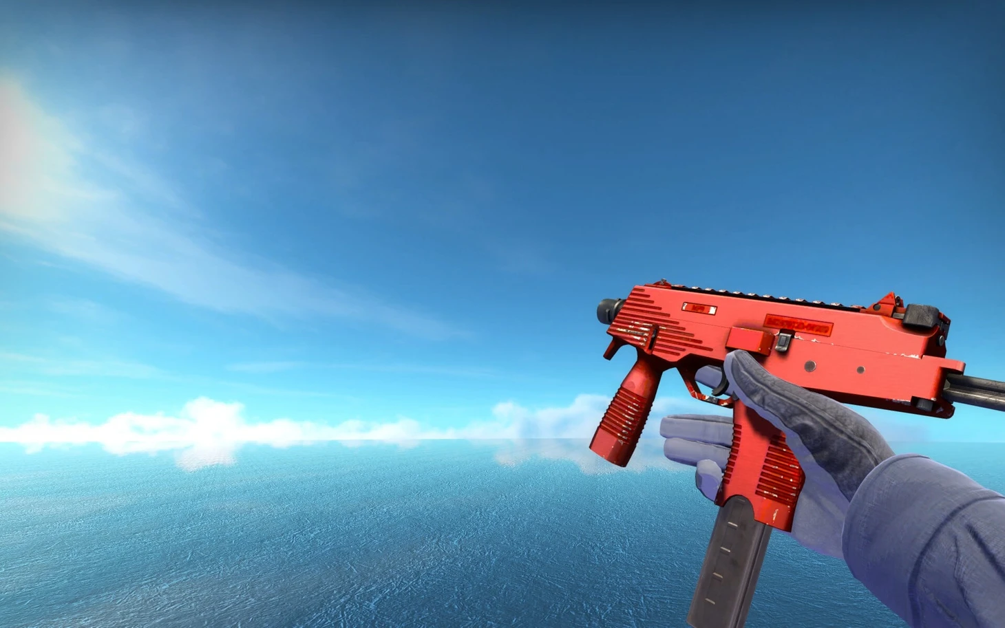 С выбором Glock-18 все проще. Единственный красный Глок – «Карамельное яблоко», стоимость качества «Прямо с завода» – всего 50 рублей. Есть более дорогой «Дух воды», но сочетание красного и синего не вписывается в подборку.