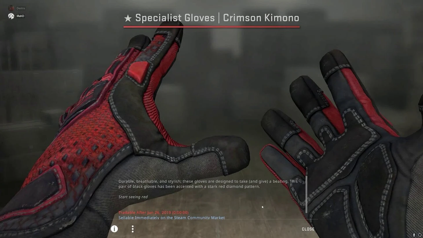 И в завершение инвентаря – перчатки. На выбор есть «Кровавое кимоно» за 360 тысяч рублей и «Кровавая паутина» за 250 тысяч рублей. На «Кимоно» более яркий и насыщенный красный цвет, в то время. Поэтому их лучше сочетать с яркими красными скинами, например – «кровавый спорт». В то время как «Паутина» подойдет к темным скинам, например к эмке «Вою».