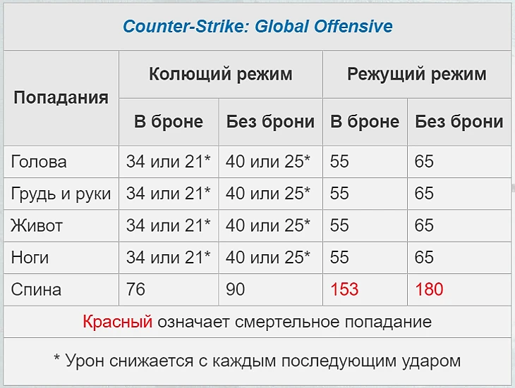 В текущей версии CS:GO урон от ударов ножом по разным частям тела выглядит следующим образом.