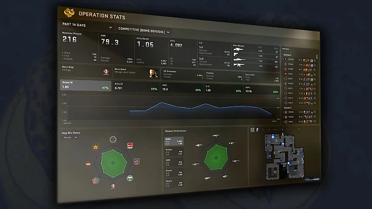 Появилась подробная статистика по матчам, на которой показывается K/D, ADR, количество убийств, любимые оружия и карты. Сейчас статистика доступна только игрокам с операцией.