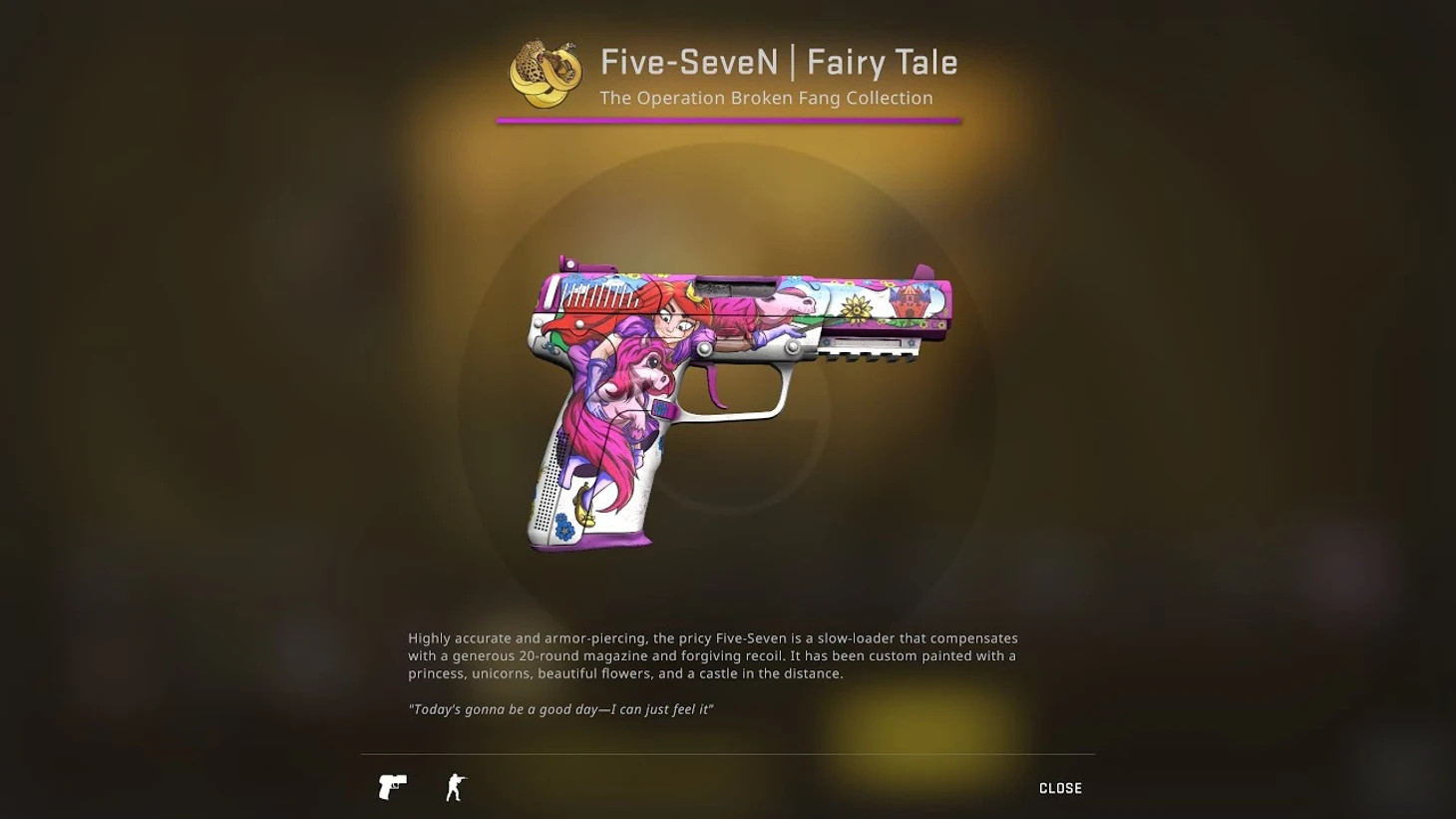 В CS:GO совсем немного сказочных скинов, и это – один из них. Яркое небо, пони и принцесса с розовыми волосами – что еще нужно для того, чтобы развалить парочку террористов на эко-раунде?