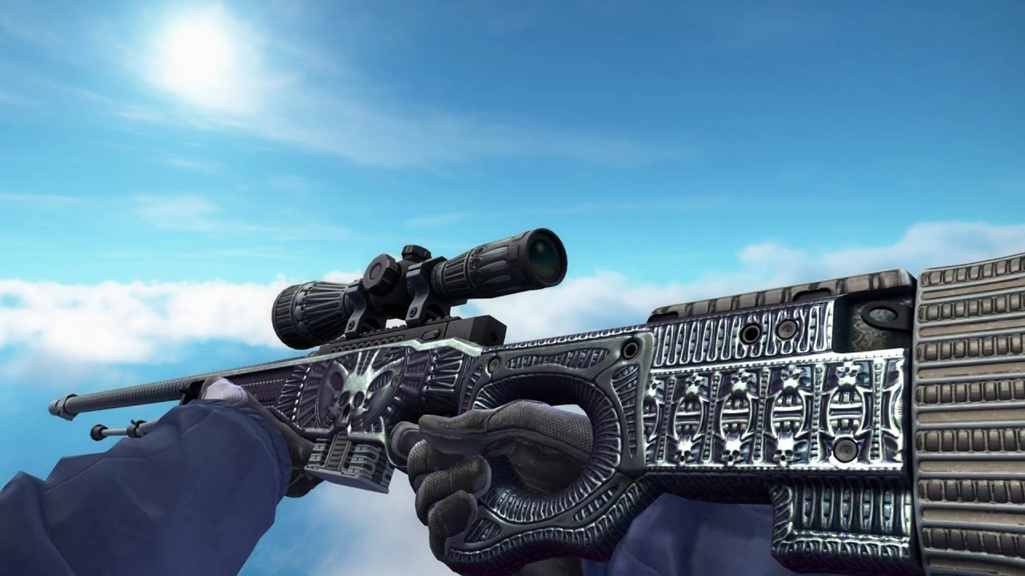 Относительно дешевый скин (можно найти экземпляры за 300 рублей), который, тем не менее, шикарно выглядит. Мощный дизайн с металлическими гравировками наверняка понравится многим снайперам.