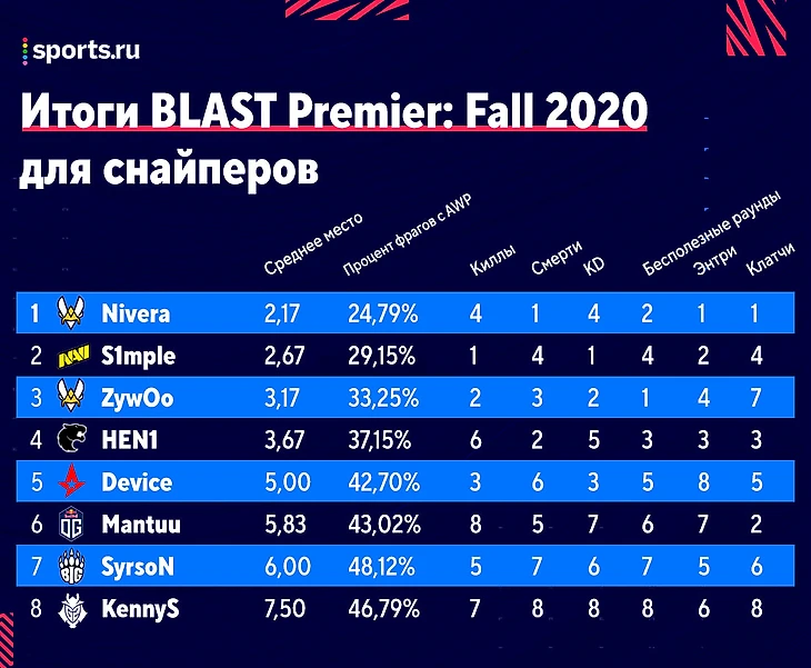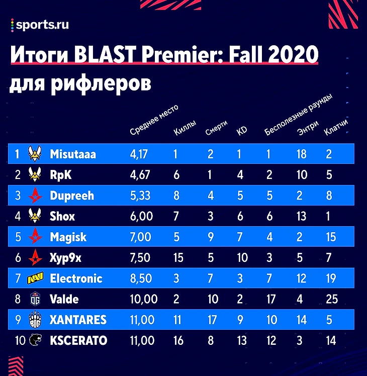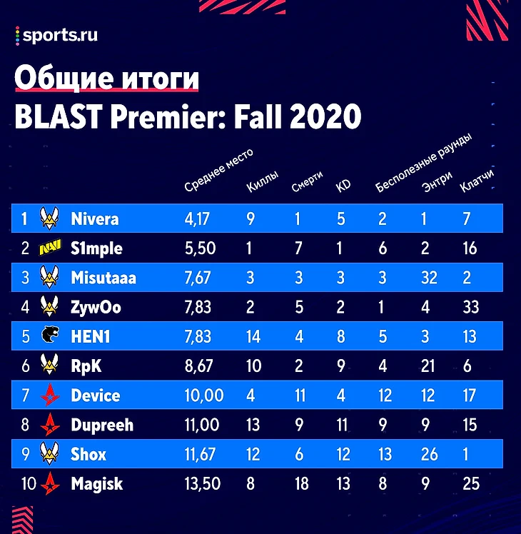 Рейтинг лучших игроков BLAST Premier: Fall 2020: Нивера – топ-1, Симпл выше Зайву, а Мисута – лучший рифлер