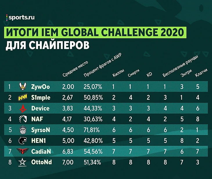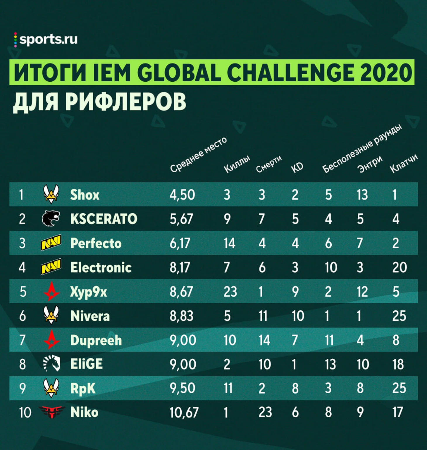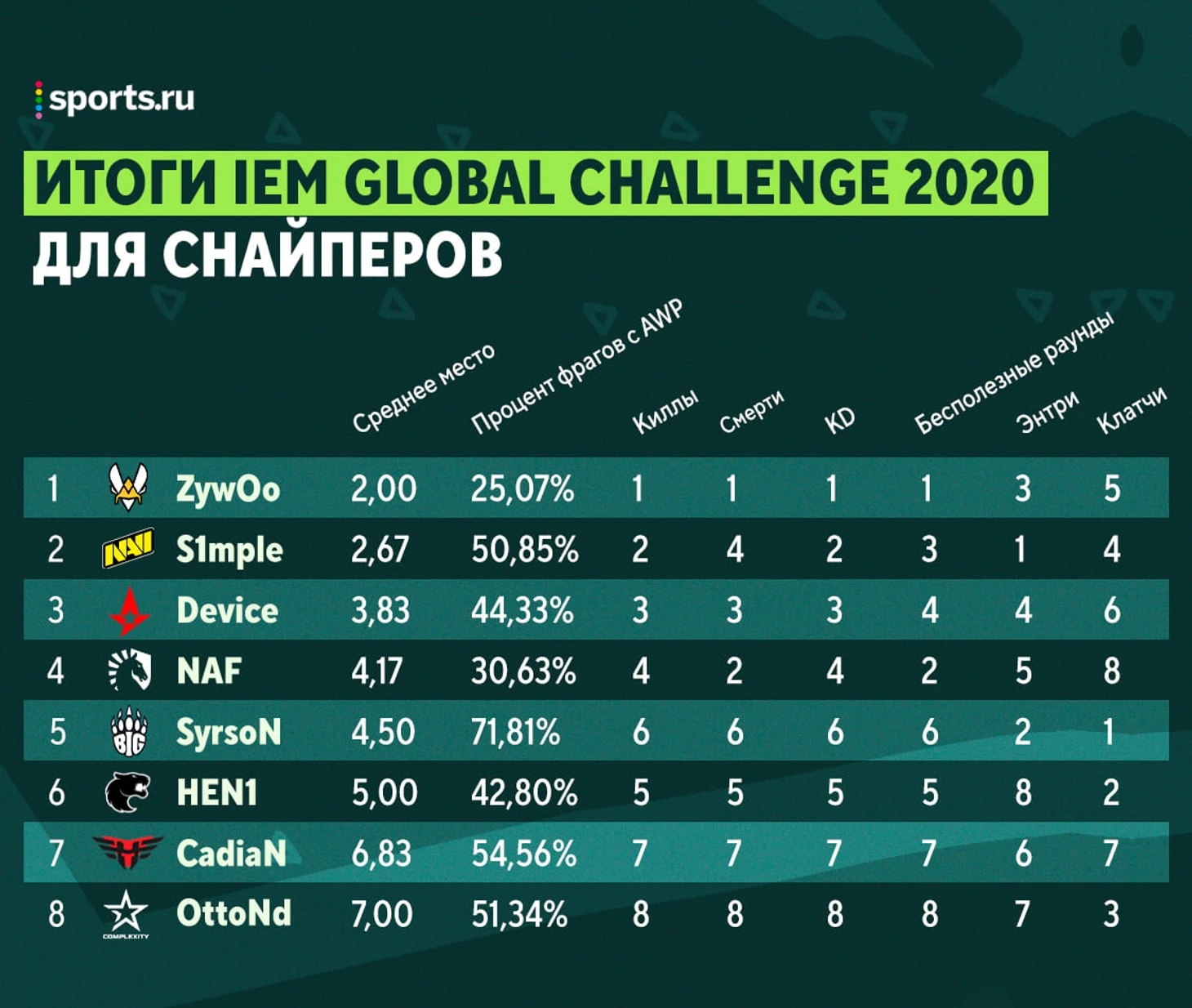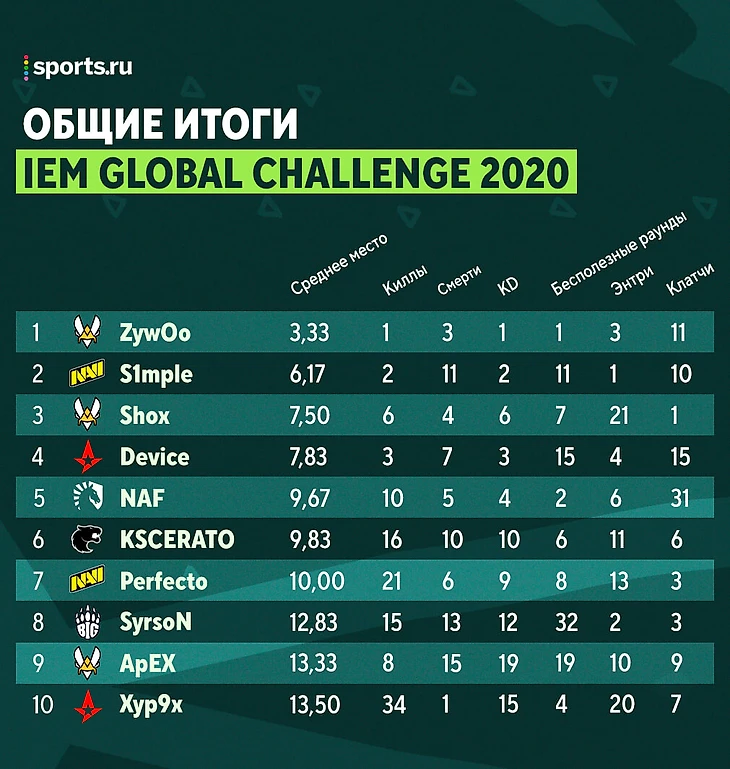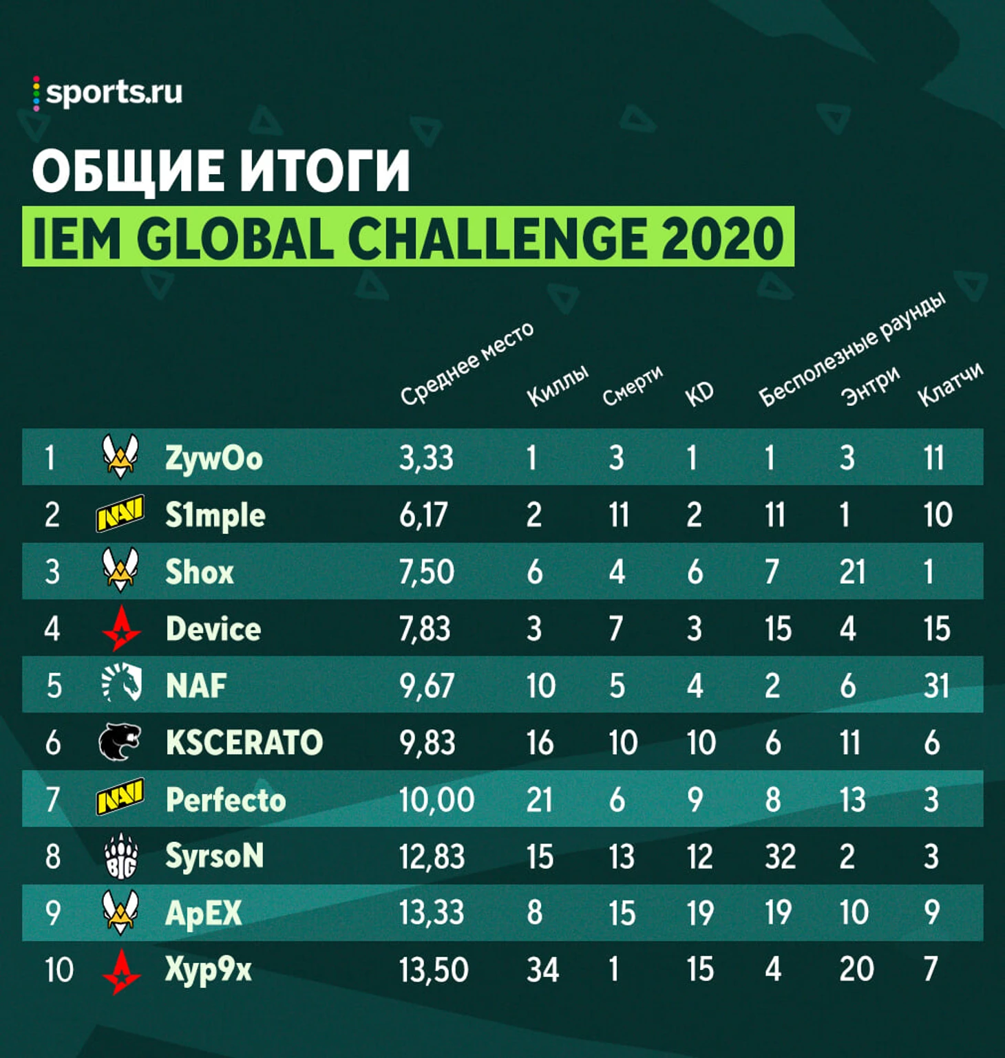 Рейтинг лучших игроков IEM Global Challenge 2020: Зайву – вне конкуренции, Симпл – топ-2, а Шокс – лучший рифлер