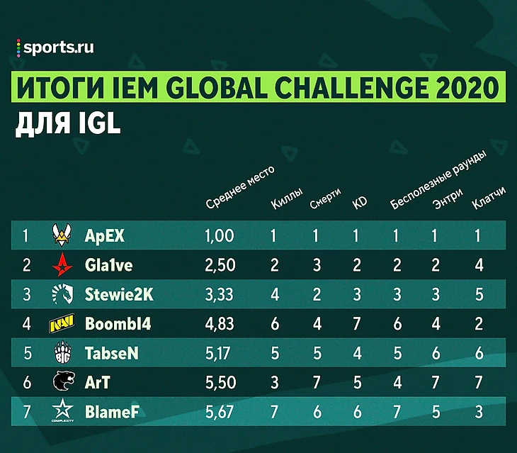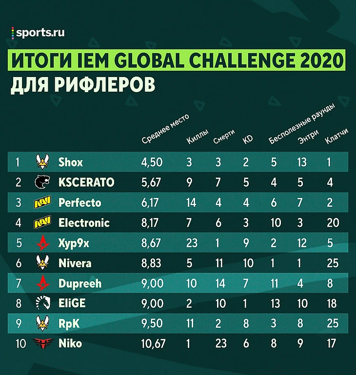 ★ В рейтинг не вошли Bubzkji из Astralis, B1T из Natus Vincere и Misutaaa из Team Vitality, сыгравшие не более 3 карт. Если бы их статистика была включена, то Бит занял бы места ниже средних (16-е на своей позиции и 23-е в общей таблице), Бубзки стал бы худшим игроком турнира (28-я и 43-я строчка соответственно), а Мисута вошел бы в итоговые топы с 4-й позицией в рейтинге рифлеров и 8-й в общем.