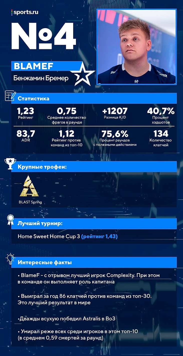 Цитата о 4-м месте: «Я пересмотрел 39 демок за первую неделю отпуска. У меня нет так называемых перерывов от игры. Мне нравится сидеть и смотреть Counter-Strike, придумывать новые идеи. Я просто не выгораю от этого», – BlameF о том, чем занимался в перерыве между турнирами.