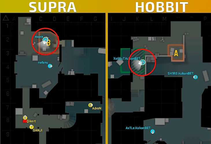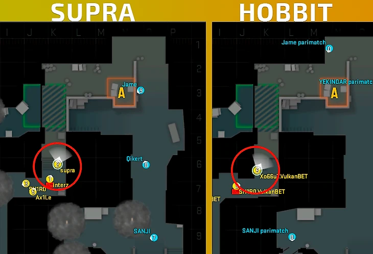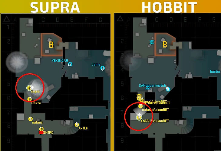 Опираясь на разбор DEMO записи, можно с уверенность сказать, что Supra в защите исполнял роль классического опорника точки Б на карте de_dust2, Hobbit же действует больше в качестве игрока, который помогает тиммейтам на старте раунда гранатами (например занятие длины), затем может уйти на Центр карты и отвечать за эту позицию, а впоследствии помочь еще и под точкой Б, либо остаться на точке А и занять позицию "Гуся", если Gambit пытаются угадать направление вектора атаки соперника. Далее по картинкам мне удалось найти похожие моменты в обоих играх, чтобы на примере разобрать, как действует тот или иной игрок.