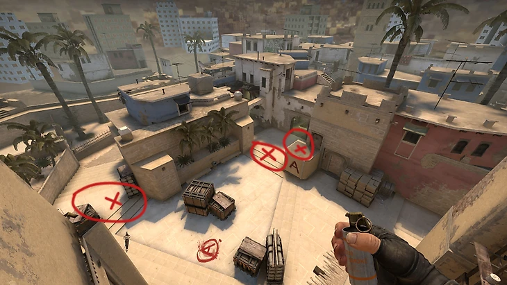 Для того, чтобы успешно занять эту точку, как правило нам понадобятся всего 3 смока. Закрывать будем stairs (головы), джангл (хелпа) и CT, как отмечено на картинке ниже.