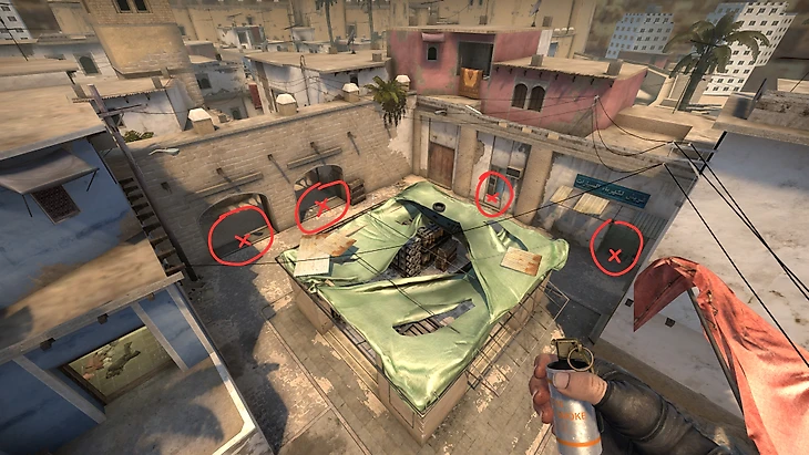 Поэтому я кидаю несколько иную модификацию этого смока, без щели справа, но в то же время и без щели слева, чтобы не открываться под окно. Чтобы бросить этот смок, встаете в противоположный угол и целитесь в центр переплетения антенн, как показано на видео. И нажимаете ЛКМ.