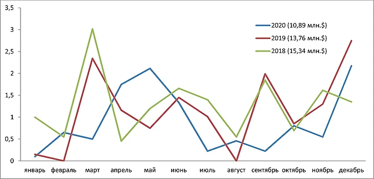 На первом графике представлены суммарные призовые ежемесячно в млн.$. Видим, что 2018 и 2019 характеризуются одинаковой динамикой изменения с ярко выраженным стартом года, весенним затишьем, небольшой активностью до середины лета и осенним всплеском. В 2020 был лишь весенний всплеск, обусловленный проведением ранее запланированных lan-турниров в online формате с увеличением призовых фондов за счет снижения организационных издержек, что видно на третьем графике. При этом в 2019 и 2020 наметилась тенденция на яркое завершение года. Остается надеяться, что это действительно тенденция. Тем не менее, сумма призовых за год неутешительно и устойчиво снижается с 15,34 млн.$ в 2018 до 10,89 млн.$ в 2020.