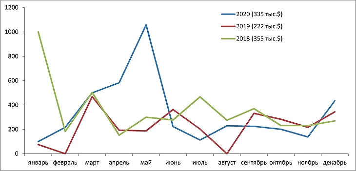На третьем графике представлена средняя сумма призовых ежемесячно в тыс.$. По этому показателю 2018 был значительно лучше 2019 при равном количестве турниров (355 тыс.$ против 222 тыс.$), а 2020 обнадежил лишь весенними турнирами с увеличенными призовыми фондами за счет ранее упомянутого снижения организационных издержек.